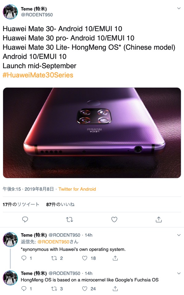 的 Twitter 用户称,华为 Mate 30 系列将在九月中旬发布,其间 Mate 30 和 Mate 30 Pro 将搭载根据 Android 10(Android Q)的 EMUI 10,Mate 30 Lite 的我国版搭载鸿蒙 OS,国际版仍然运用根据 Android 10 的 EMUI 10。