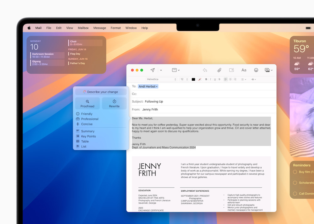 无论是收拾讲堂笔记,检查博客文章是否通畅,亦或保证电子邮件行文得当,Writing Tools 能够帮忙用户提高关于文字表达的决心。Apple Intelligence 的改写东西能够让用户挑选不同的版别,依据受众和文稿诉求调整文风。无论是对求职信进行润饰,仍是为派对请柬增加几分诙谐和构思,改写功用总能辅佐用户写出最得当的文字。Proofread 东西能为用户检查语法、遣词和句子结构,还能一起给出修正主张,以及对修正主张的阐明,便当用户检查或快速选用。Summarize 东西可在用户选中文本后,以易于了解的阶段、关键罗列、表格或列表的方法对其进行概括总结。